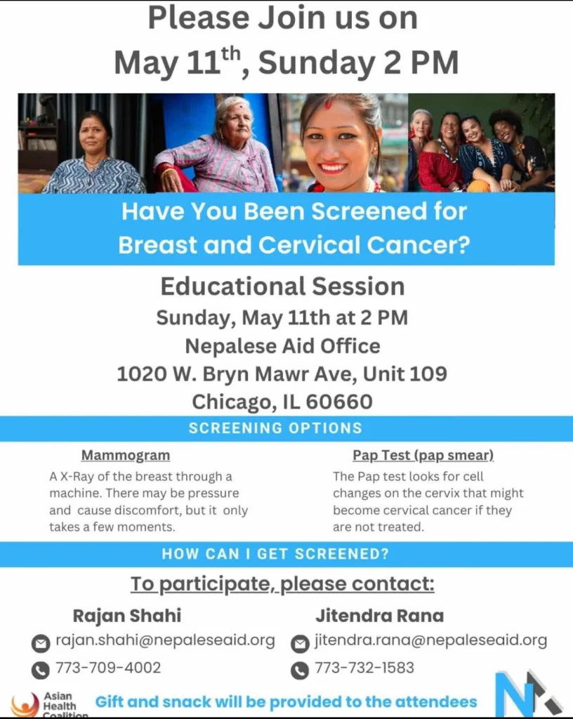 नेपलिज एड सिकागोले हाम्रो समुदायका महिला दिदी बहिनि तथा आमाहरुको लागि स्तन तथा पाठेघरको क्यान्सर सम्बन्धि जानकारीमुलक शैक्षिक कार्यक्रम संचालन गर्न लागेकोले तपसिलको मिति, समय र स्थानमा उपस्थित भैदिनुहुन हार्दिक अनुरोध गर्दछौं।