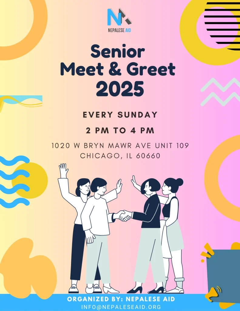 नेपलिज एड सिकागोले हाम्रा आदरणीय बुवा-आमा, काका-काकी, दाजु-भाउजु, दिदि, बहिनि तथा पाको उमेरका सिनियर नागरिकहरुका लागि ‘सिनियर भेटघाट कार्यक्रम २०२५’ जुन महिना देखि हाललाई आइतबार दिउँसो २ देखि ४ वजे सम्म संचालन गरिरहेको छ। नेपाल देखि घुम्न आउनु भएका तथा सिकागो वरपर बसोबास गर्ने हाम्रा श्रद्देय सिनियर नागरिकहरुका लागि एकै ठाउँमा भेटघाट गर्ने, आफना अनुभवहरु आदान प्रदान गर्ने, केहि सिप सिक्ने, आफुले जानेको सिप सिकाउने, नेपाली टिभी कार्यक्रम हेर्ने, विभिन्न मनोरन्जनात्मक खेलहरु खेल्ने, चिया, कफी, खाजा, नास्ता गर्ने गरि विदेशको बसाई आनन्ददायी बनाउने हाम्रो प्रयास रहनेछ। आफ्ना बुवा-आमा, नातेदार, सिनियरहरुलाई सहभागी हुन पठाईदिनु हुन र कार्यक्रमलाई राम्रो र रमाइलो बनाउन सुझाउनु हुन विनम्र अनुरोध गर्दछौं।
